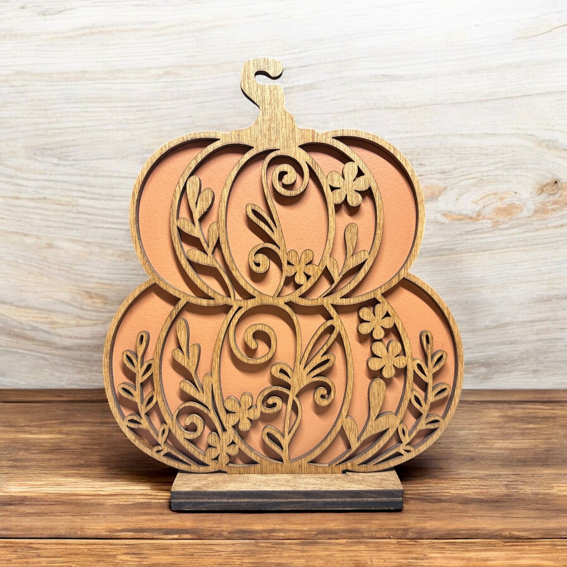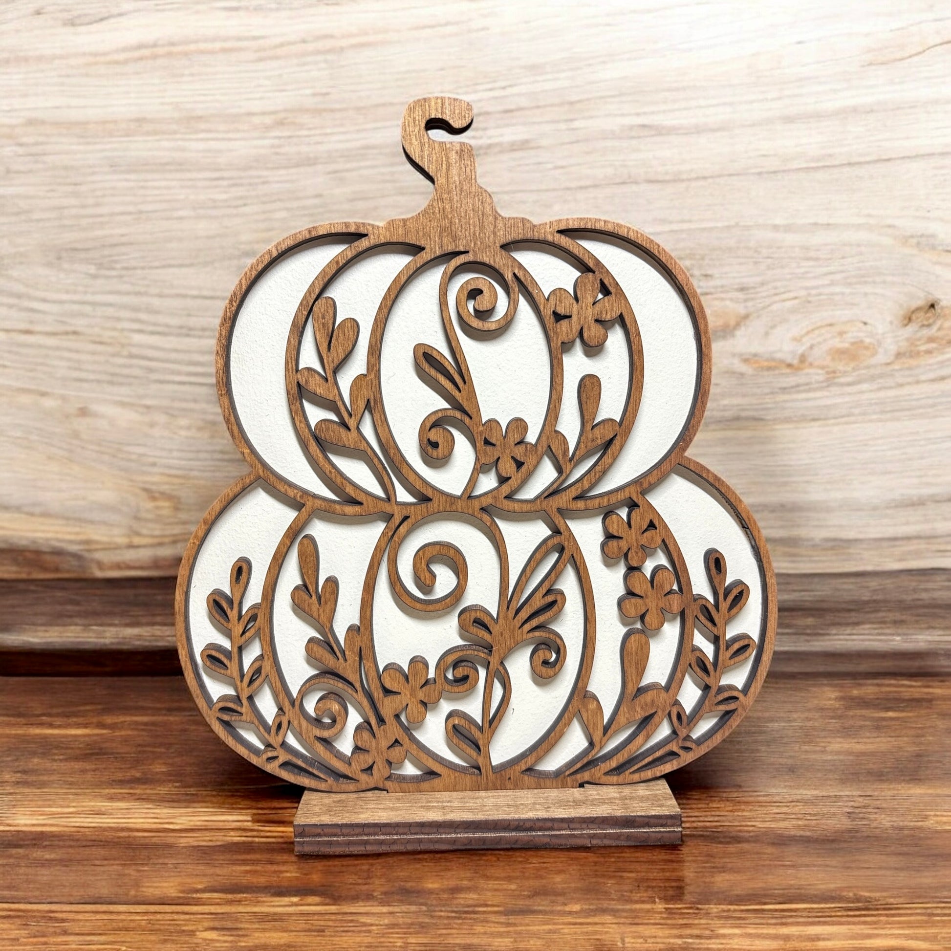 Enhance your space with the Floral #2 Duo Stacked Pumpkins wood decor. This charming piece features two pumpkins stacked and decorated with floral accents, perfect for adding a cozy, seasonal touch to any room.