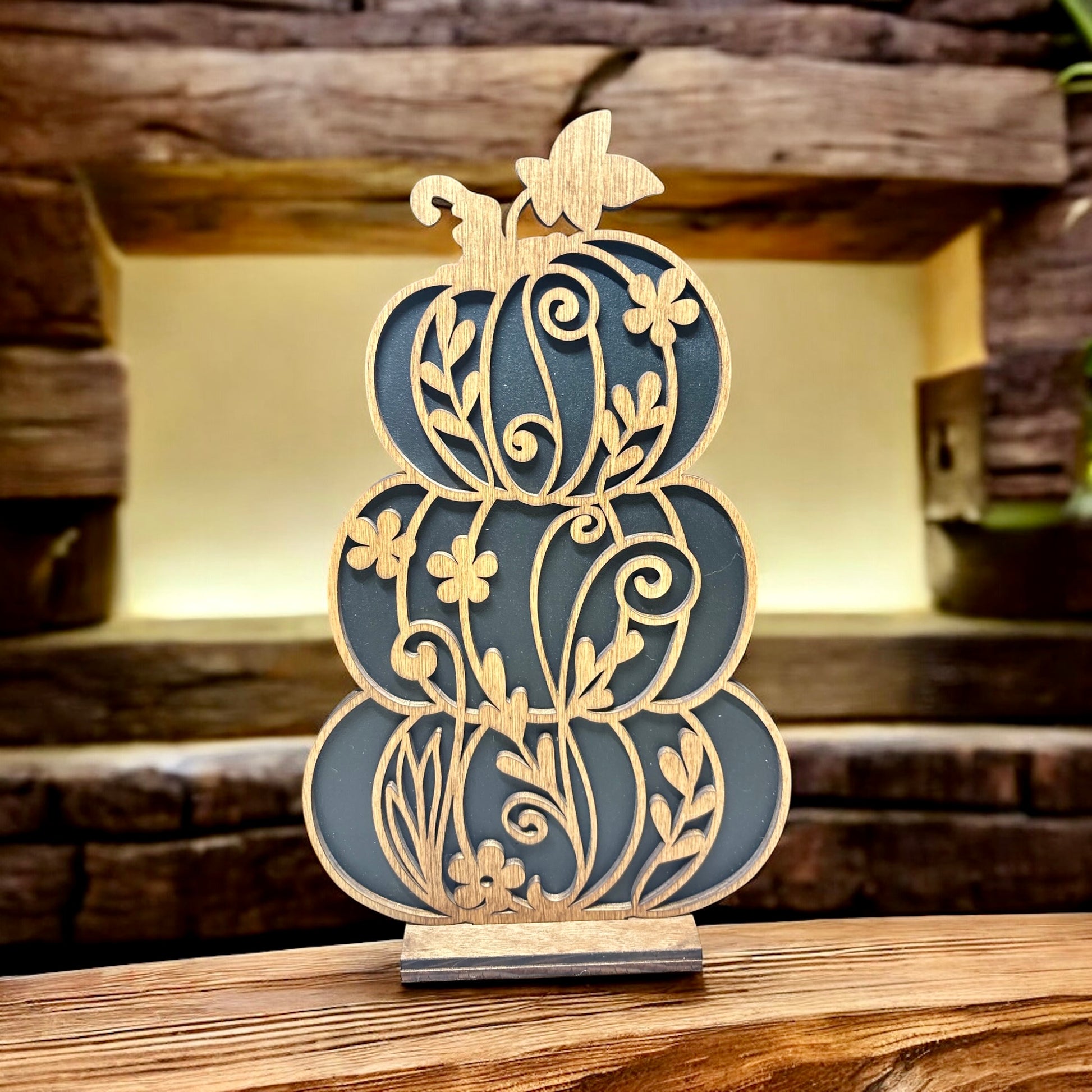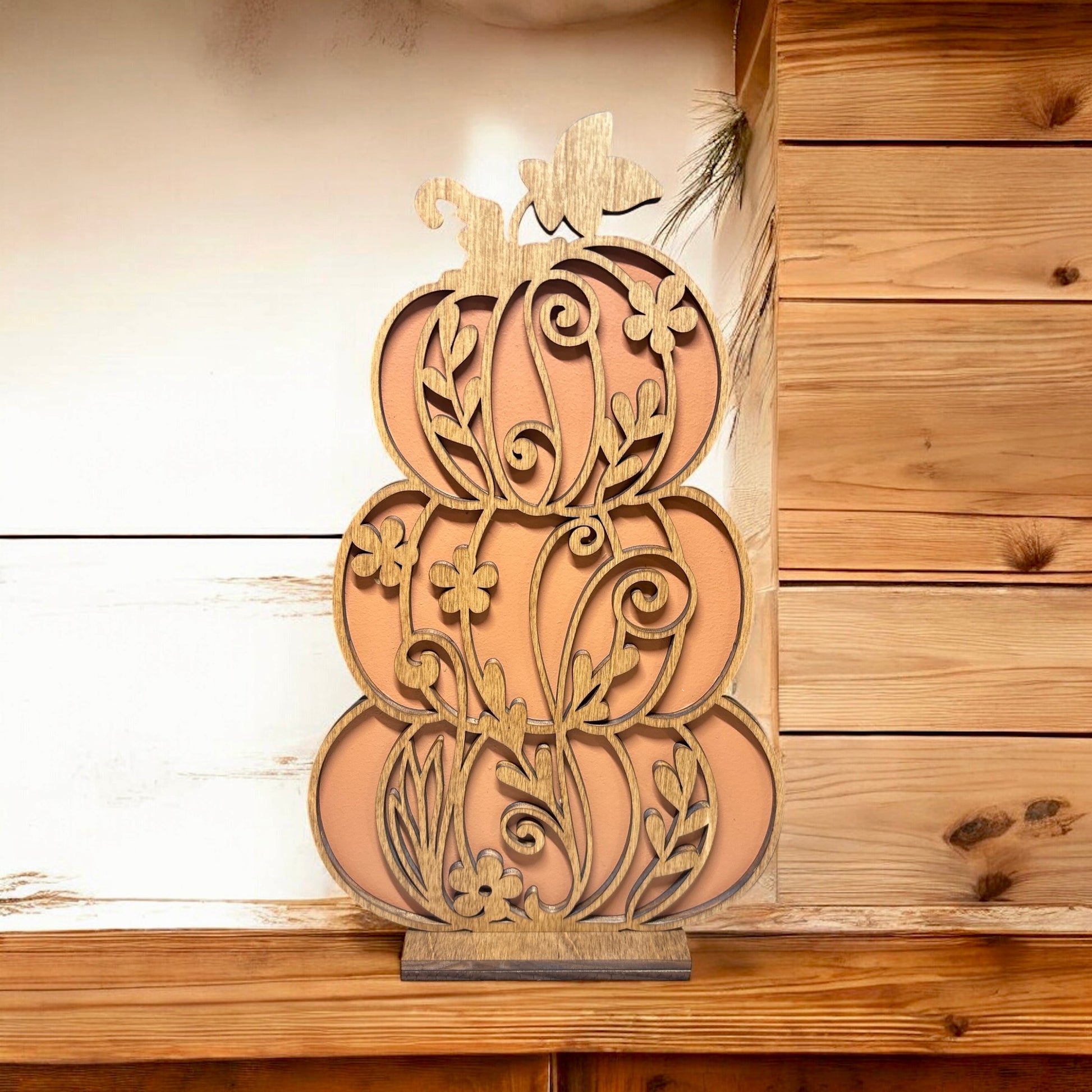 Add a touch of charm to your space with the Floral #2 Trio Stacked Pumpkins wood decor. This decorative piece features three stacked pumpkins adorned with delicate floral accents, perfect for bringing a cozy, seasonal feel to any room.