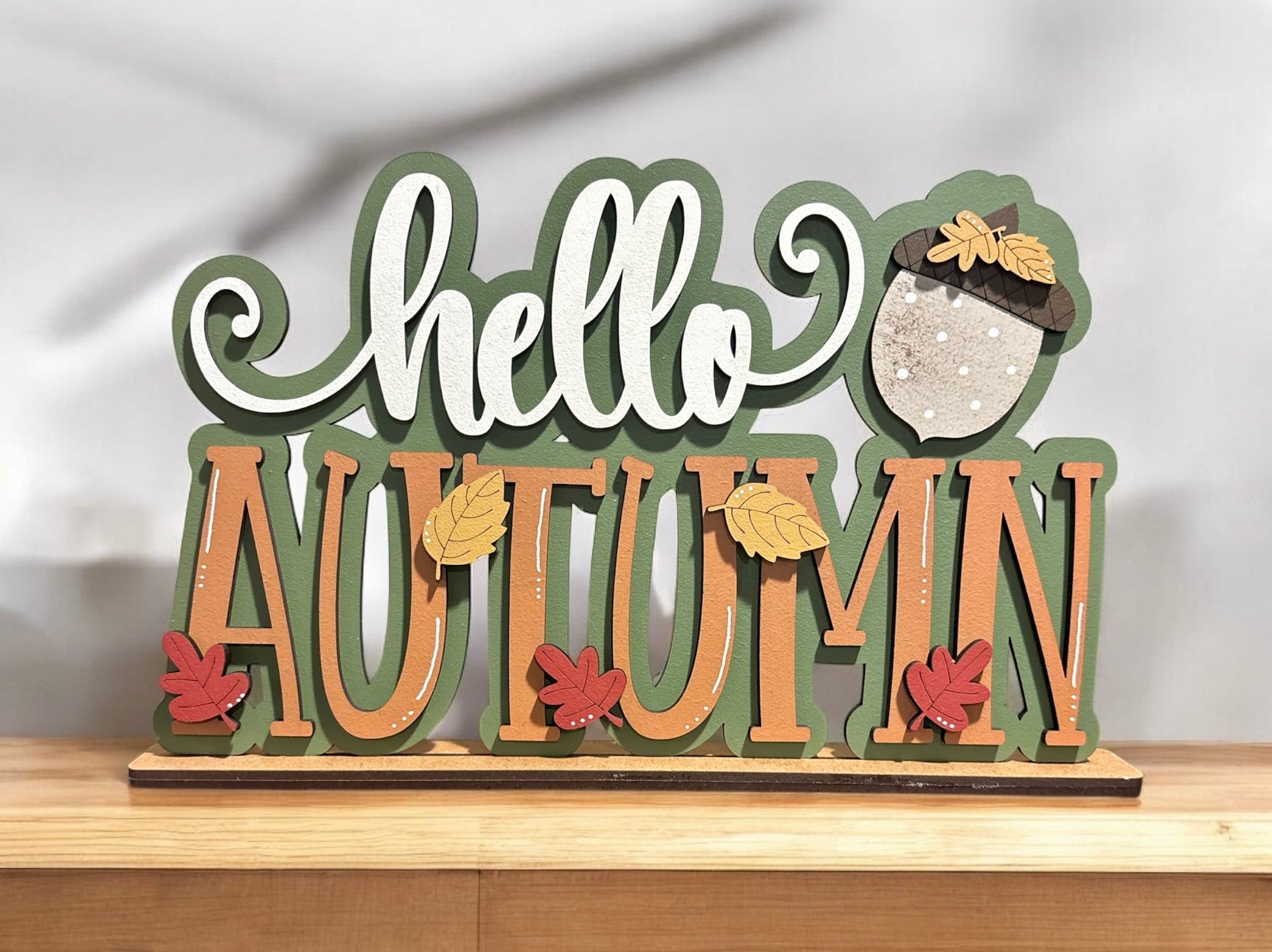 The Hello Autumn Shelf Sitter adds a warm touch to your home with its fall-inspired design. Crafted from wood and decorated with acorns and leaves in rich autumn colors, it’s a simple way to bring seasonal charm to any shelf or tabletop.