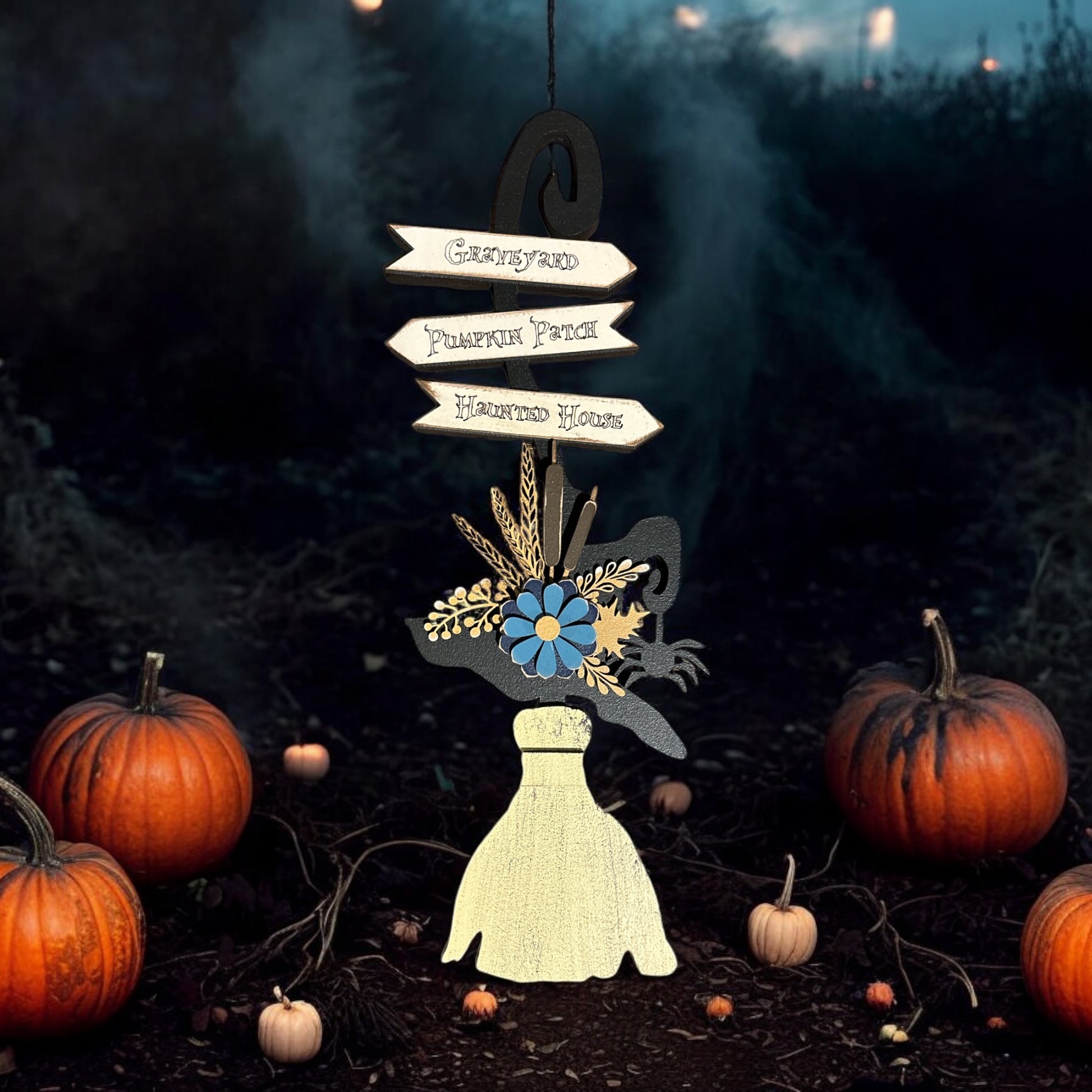 This small wood home decor features directional signs labeled Graveyard, Pumpkin Patch, and Haunted House, perfect for adding a spooky touch to your Halloween decorations. Its compact size makes it easy to place anywhere in your home, creating a festive and eerie atmosphere.
